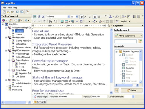 HelpNDoc é uma utilidade gratuita mais que interessante para criar todo tipo de ajudas . Trata-se de um editor visual muito fácil de utilizar, e que resulta ideal para criar ajudas, seja para incluí-la nas suas aplicações, como para inseri-la na sua página web . Cria uma estrutura em árvore com a qual é muito fácil manter uma ordem clara e prática . Além disso é realmente fácil criar cada categoria, inclusive poderá criar palavras chave para que apareçam quando o usuário realize uma busca .