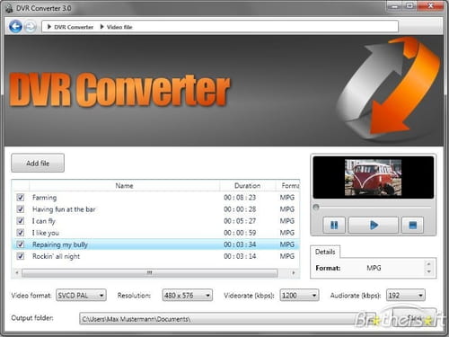 Com o conversor de DVR, converter seus arquivos com facilidade DVR. OPT. Tod. Vro. Mod e. Ts WMV, DivX, Xvid, HDX4, AVI ou MP4. Este software é muito fácil e pode exibir os parâmetros dos arquivos de entrada, tais como resolução, taxa de amostragem e taxa de bits. Ao mesmo tempo, ele também cuida de localizar automaticamente a proporção adequada.