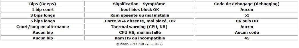 bios", AWARD, (onde se encontram os Bios principalmente dos fabricantes MSI e Gigabyte) parece ter abandonado os bips como codificação dos erros, com a exceção do habitual boot bios block (bip curto "de boa saúde"), somente é necessário fazer confiança as mensagens afixadas na tela durante a (como, por exemplo, o famoso "