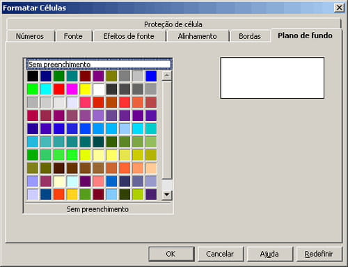 Plano de fundo (Calc)/Preenchimento (Excel): define a cor de fundo da seleção. O Excel também permite que você selecione um padrão de preenchimento. Para excluir, ao mesmo tempo, a cor de um preenchimento e um padrão, selecione as células em questão, clique na caixa de lista Cor de preenchimento e escolha