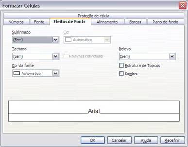 Efeitos de fontes: ajuda (entre outras) a adicionar um efeito de relevo, um contorno e/ou um sombreamento dos caracteres do conteúdo da célula: