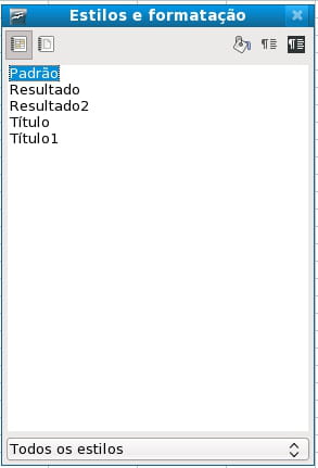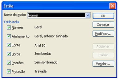 Padrão corresponde ao estilo Normal do Excel. Os outros estilos disponíveis (Título, Título1, Resultado e Resultado2) lidam com diferentes parâmetros (negrito, tamanho, etc). Os estilos Monetário e Porcentagem também existem, mas não são acessíveis a partir desta caixa de diálogo: use os botões correspondentes na barra de ferramentas de Layout de página.