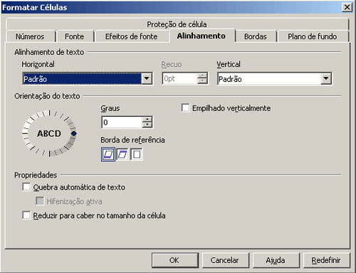 Alinhamento: além do alinhamento horizontal (Esquerda, Direita, Centro), que aliás pode ser ajustado diretamente na barra de ferramentas, esta guia ajusta o alinhamento vertical (Superior, Centro, Inferior, Justificado) e a orientação do texto. A opção de