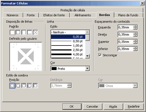 Bordas: define o tipo e a cor das bordas a serem aplicadas à seleção. As bordas chamam a atenção para certos números, ou separam bem as diferentes seções de uma mesma planilha: