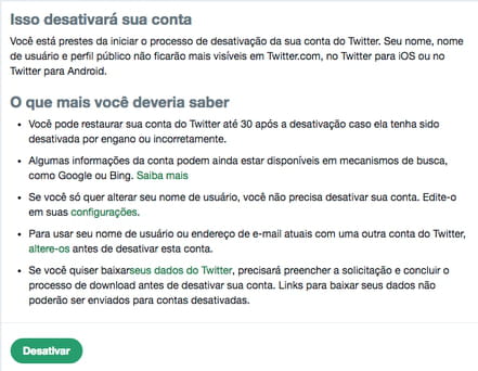 Twitter. Para isso, você deve primeiramente desativá-la. Seu perfil, então, ficará inativo durante 30 dias - período durante o qual você pode reativar seu perfil. Passado esse prazo, a conta é deletada definitivamente.