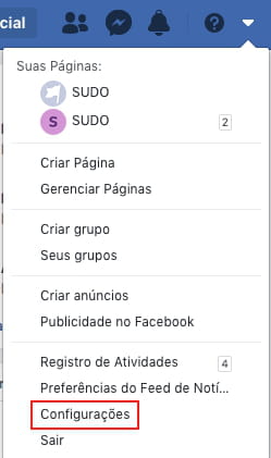 Para desativar sua conta do Facebook, clique na seta no canto superior direito e selecione
