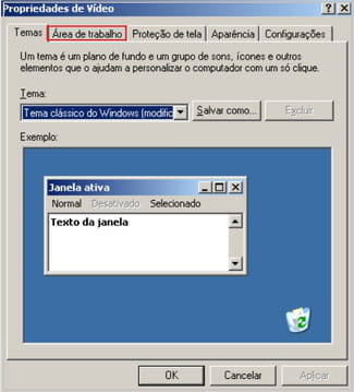 Windows XP, clique com o botão direito do mouse na área de trabalho, depois em
