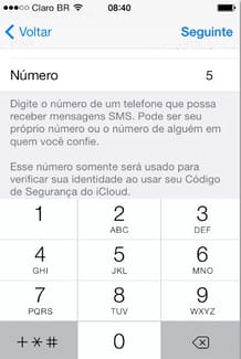 Opções Avançadas na tela de digitação do código do iCoud. Selecione a opção que lhe convier, toque nela e siga as instruções. Digite o número do seu telefone, ou outro qualquer que você tenha acesso, para a verificação de sua identidade: