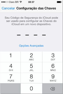 Para ativá-las é exigido a sua identificação iCloud para continuar a configuração. Digite sua senha ou crie uma, se for o caso. Esta é a primeira vez que você faz essa configuração em um de seus dispositivos? Então você deverá criar um código de segurança. A segurança exige isso, pois dessa forma você terá o controle de quais dispositivos terão acesso aos seus dados sincronizados. Agora, você deverá entrar seu código de segurança iCloud, para configurar as Chaves do iCloud em qualquer outro dispositivo. Você deverá digitar duas vezes o seu código: