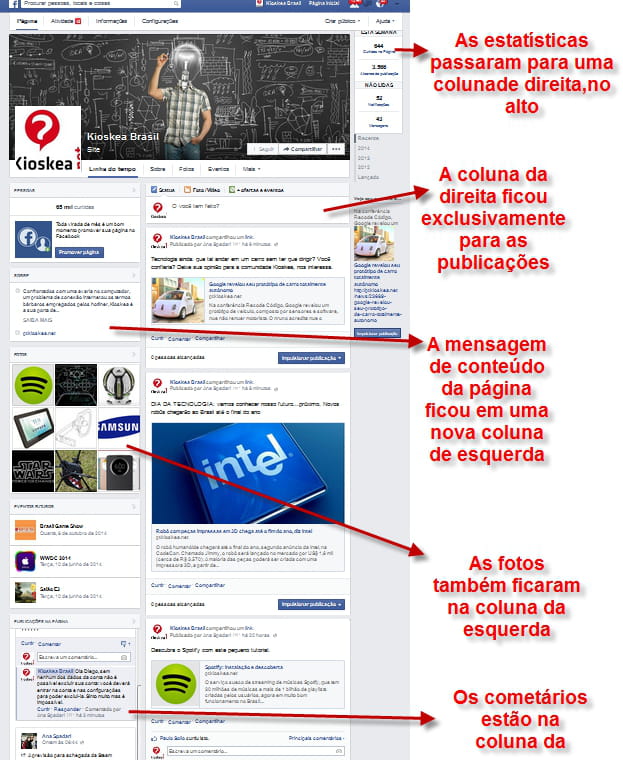 Facebook alterou o layout da página profissional. Descubra abaixo como ela ficou. Todo o layout ficou alterado. As publicações estão todas reunidas em uma coluna à direita. As estatísticas ficam mais visíveis, bem ao lado da foto de capa. As fotos foram para uma coluna da esquerda, abaixo da mensagem com o conteúdo da página. Esta última sem muita visibilidade, ficou sem destaque.