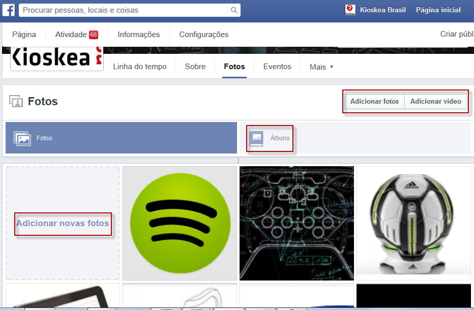 Para carregar ou gerenciar as fotos com o novo layout faça o seguinte: pelo menu horizontal bem abaixo da foto de capa, clique na seta à direita na margem superior direito do setor de fotos. Basicamente, para importar uma foto os passos são os mesmos:
