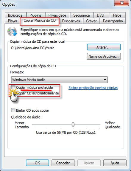 Windows Media Player não é capaz de extrair faixas de áudio de CDs. Como habilitar a importação de arquivos de áudio protegidos?