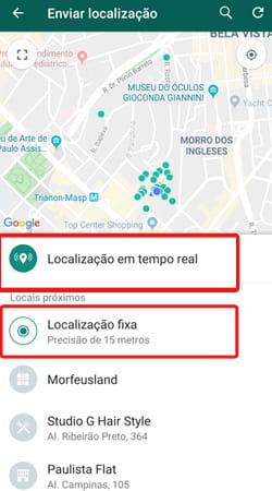 Localização em tempo real<bold> ou uma <bold>Localização fixa. Existe, ainda, a possibilidade de escolher um local próximo à sua posição (centro comercial, praça, igreja, etc.):