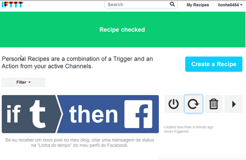 Check recipe now (Verificar a receita agora). Em caso de problema, vá nos dois sites e verifique nas configurações de módulos ou conexões, se tudo foi autorizado: