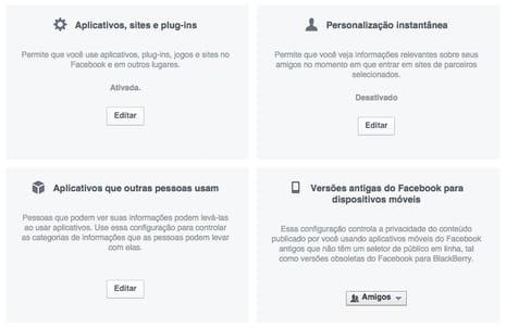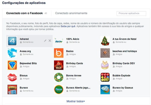 Configurações dos aplicativos conectados com o Facebook