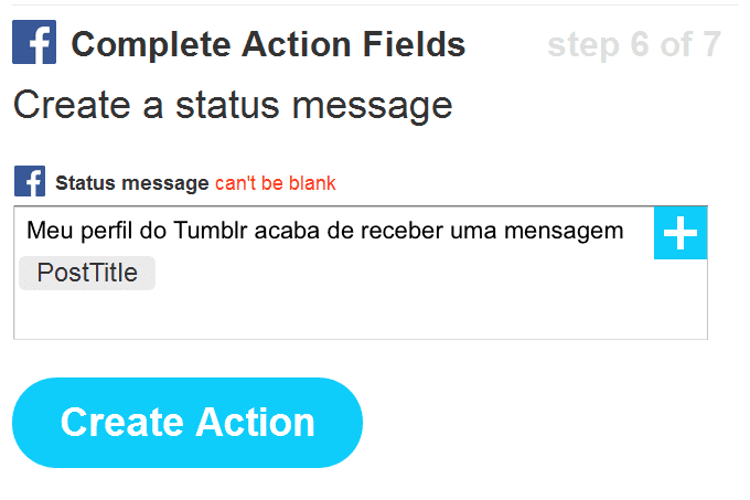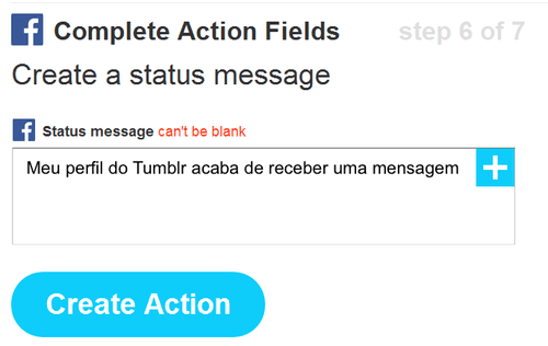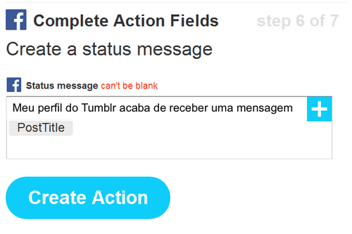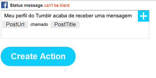 Create status message (Criar mensagem de status), então, criar uma mensagem no Facebook (perfil, do contrário, é preciso usar o canal do Facebook page ou do Facebook Group): Meu perfil do Tumblr acaba de receber uma mensagem: