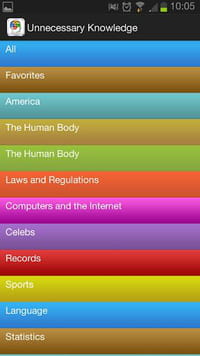 Você sabia que ...?. Este aplicativo te informa sobre histórias engraçadas e interessantes sobre todos os tipos de assunto. Por exemplo: "A cada ano, morrem mais pessoas por causa de rolhas de champanhe do que de picada de cobra venenosa". Os fatos são classificados por tipo de assunto, e você só terá que escolher o que mais te interessa. Deslize o dedo da esquerda para a direita para passar para o próximo assunto. Com este aplicativo você terá várias