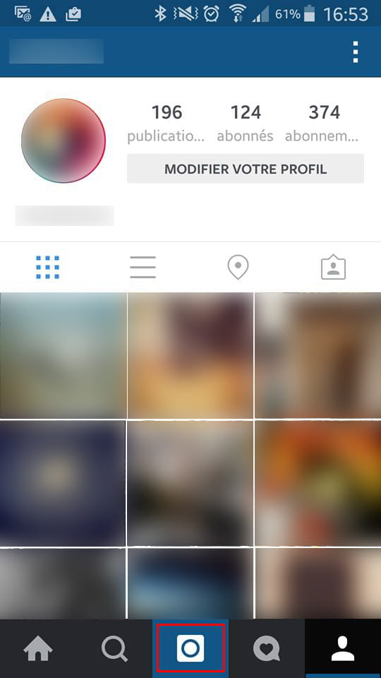 É muito fácil postar uma foto ou um vídeo. Em sua página inicial, clique no botão central, na parte inferior da tela (em vermelho):