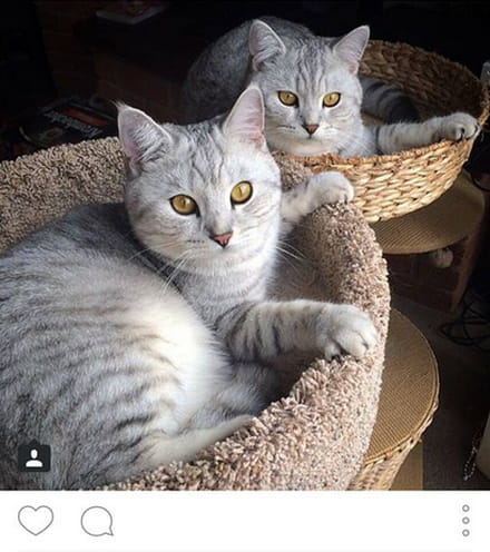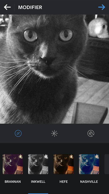 Para confirmar a sua escolha, clique na seta azul no canto superior direito da tela, sua foto será cortada na forma de um quadrado (você não tem escolha, este é o formato imposto pelo aplicativo). Isto o levará para a parte mais interessante do Instagram: a adição do filtro e a edição. Você poderá escolher o filtro que quiser entre os vinte filtros propostos (eles aparecem na parte de baixo da tela) e, em seguida, você poderá, se quiser, fazer algumas alterações básicas, tais como ajustar o contraste, o brilho, adicionar um borrão, colocar uma moldura, etc (os ícones logo acima dos filtros). Para o exemplo do gato, selecionamos o filtro