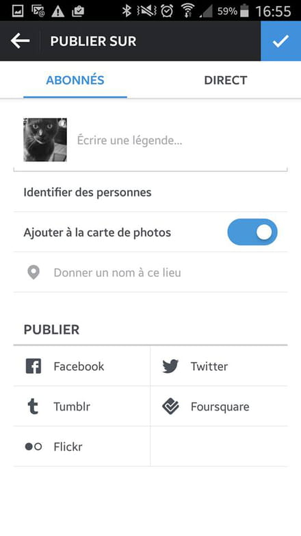Para terminar, confirme a sua foto ou vídeo outra vez, com a seta azul situada no canto superior direito da tela. Na tela que aparece, você poderá adicionar um comentário e as suas hashtags e compartilhá-lo nas redes sociais: Twitter, Facebook, Foursquare ou Tumblr.