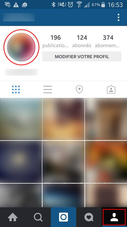 Depois de instalar o aplicativo no seu smartphone, e criar a sua conta (veja a seção anterior), você poderá personalizar o seu perfil, inserindo uma imagem. Clique no ícone inferior direito da sua tela inicial, e na sua foto de perfil (quadros vermelhos):