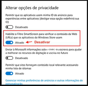 Habilite o filtro SmartScreen para verificar o conteúdo da Web (IRLs) que os aplicativos da Windows Store usam para Desativado: