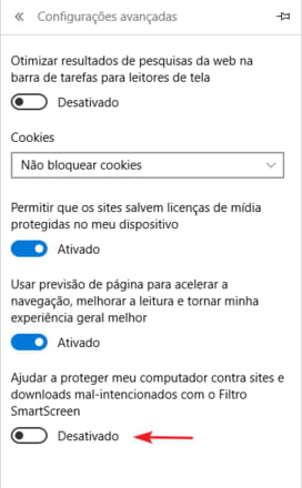 O Windows 10 também usa o filtro SmartScreen para verificar a presença de conteúdo malicioso. Para desativar esse recurso, clique em