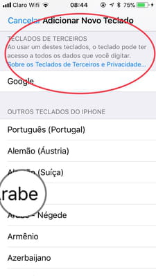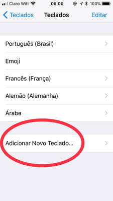 Adicionar Novo Teclado e você verá aparecer a lista dos teclados disponíveis: