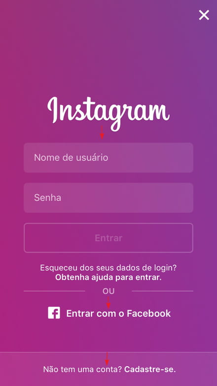 login de uma conta já criada, pelo Facebook ou, se ainda não tiver outra conta,
