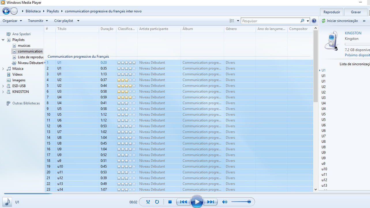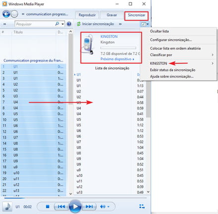 Iniciar sincronização, sobre a lista. Clique nela para que o WMP comece a transferir a sua lista de reprodução para o seu pen drive.