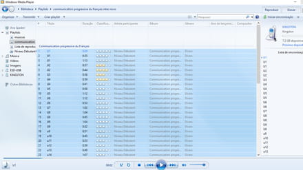 Abra o seu leitor WMP e mostre a playlist que gostaria de transferir para o pen drive. Conecte o seu dispositivo USB. Selecione as faixas com o botão esquerdo do mouse pressionado-o e arrastando-o de baixo para cima, da direita para a esquerda. Em seguida, ainda com o botão esquerdo pressionado, arraste a lista para dentro da zona de gravação, à direita da interface do WMP: