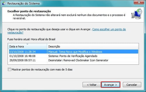 Escolha o ponto de restauração que você quer utilizar e clique em