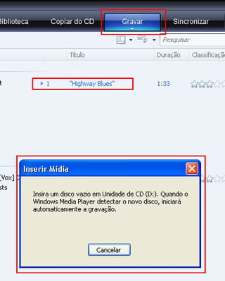 Gravar, no menu superior. Você deverá inserir um CD virgem caso ainda não o tenha feito: