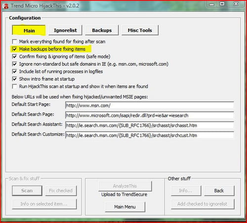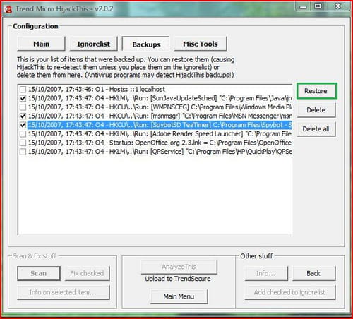Se Hijackthis foi previamente instalado corretamente, quer dizer instalado na pasta criada para este fim, um arquivo backup será criado automaticamente desde que uma linha será fixada, e assim lhe permitirá restaurar uma entrada, se esta for fixada por engano!