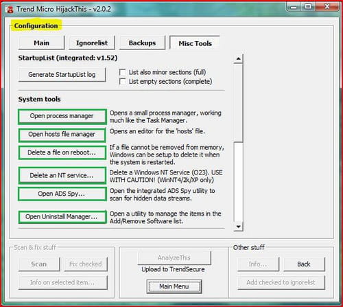 HijackThis integra uma ferramenta que permite listar todos os programas que são lançados automaticamente no arranque do computador. Esta função é similar aquela que existe já sob o windows via o comando msconfig.