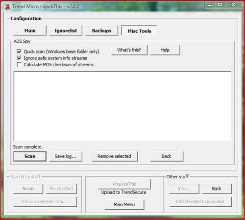 Suas pesquisas permitirão de estabelecer um primeiro resultado para identificar os problemas e orientar a pessoa para um procedimento de desinfecção mais específica! Selecionada, pois a maior parte do tempo, fixar linhas não bastará para neutralizar a infecção!! É necessário passar seguidamente suas ferramentas de desinfecção mais específicas que se ocuparão de remover todas as sujeiras ligadas à desinfecção, incluindo aquelas que poderão se esconder do relatório. É preciso então ter presente que um relatório HijackThis que parece à primeira vista « limpo » não significa necessariamente que a máquina não está infestada!