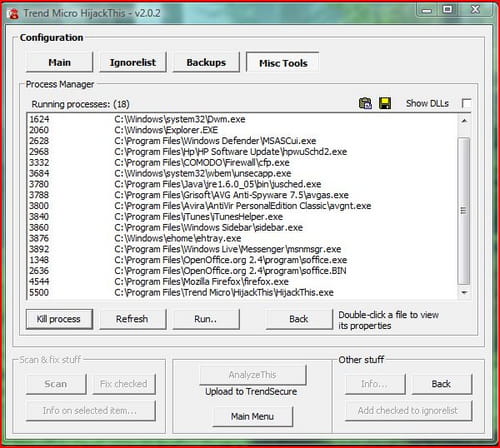 Gerenciador de Tarefas do Windows, HijackThis integra uma ferramenta que permite listar os processos ativos no PC : opção open process manager. Esta função pode mostrar-se útil se o gerenciador de tarefas não está disponível por exemplo no PC infestado para matar ou lançar processos: