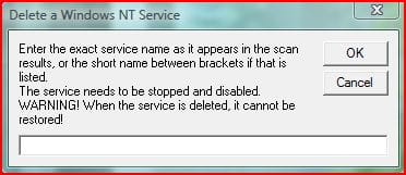 A opção delete an NT service permite remover os serviços visíveisnas Linhas 023, linhas do relatório HjackThis depois de [ser / faq/sujet-2739-windows-demarrer-arreter-un-service-en-ligne-de-commande preso ou desativado antes] da linha de comando por exemplo. Em seguida, digite o nome correto do serviço a ser removido. Atenção: depois de excluído, o serviço será restaurado! É importante garantir que a periculosidade do serviço antes de remover, caso contrário, desativá-lo bastará.