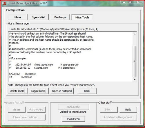 Note que quando um dos elementos fot corrigido, HijackThis modificará o registro do sistema mas não removerá sistematicamente o arquivo associado ao disco. Isto significa e implica que é necessário completar a análise do relatório estabelecendo em seguida um procedimento de desinfecção manual ou via outros programas mais específicos, e mais escolhidos de acordo com a infecção para remover as chaves ou arquivos infecciosos que permanecem.