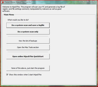 Um atalho será em seguida criado no desktop e o menu principal da ferramenta se abrirá automaticamente. Caso contrario, você deverá criar uma pasta específica para sua utilização e executar HijackThis a partir desta pasta.É importante não deixar o arquivo que você acabou de baixar entre os arquivos temporários pois quando você se fixar uma linha, a pasta backup será também criada entre estes arquivos. Ora, as pastas temporárias que são das pastas ditas sensíveis, são frequentemente limpas de seu conteúdo durante a desinfecção, e então em caso de má manipulação será impossível de re-executar HijackThis ou de restaurar uma linha fixada por engano!