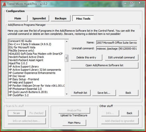 HijackThis oferece então a possibilidade de remover estes rogues a partir de sua interface ao clicar sobre a opção open uninstall manager, como isto se faz habitualmente via a opção adição/remoção de um programa presente no Windows: