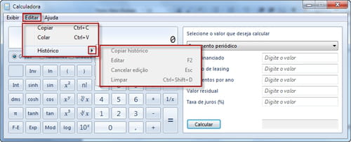 Exibir você abrirá um menu contextual, onde acessará os recursos de sua calculadora. Esses recursos poderão ser utilizados com a calculadora básica. Para acessar o recurso desejado, basta selecioná-lo. A interface das especialidades da calculadora aparece imediatamente: